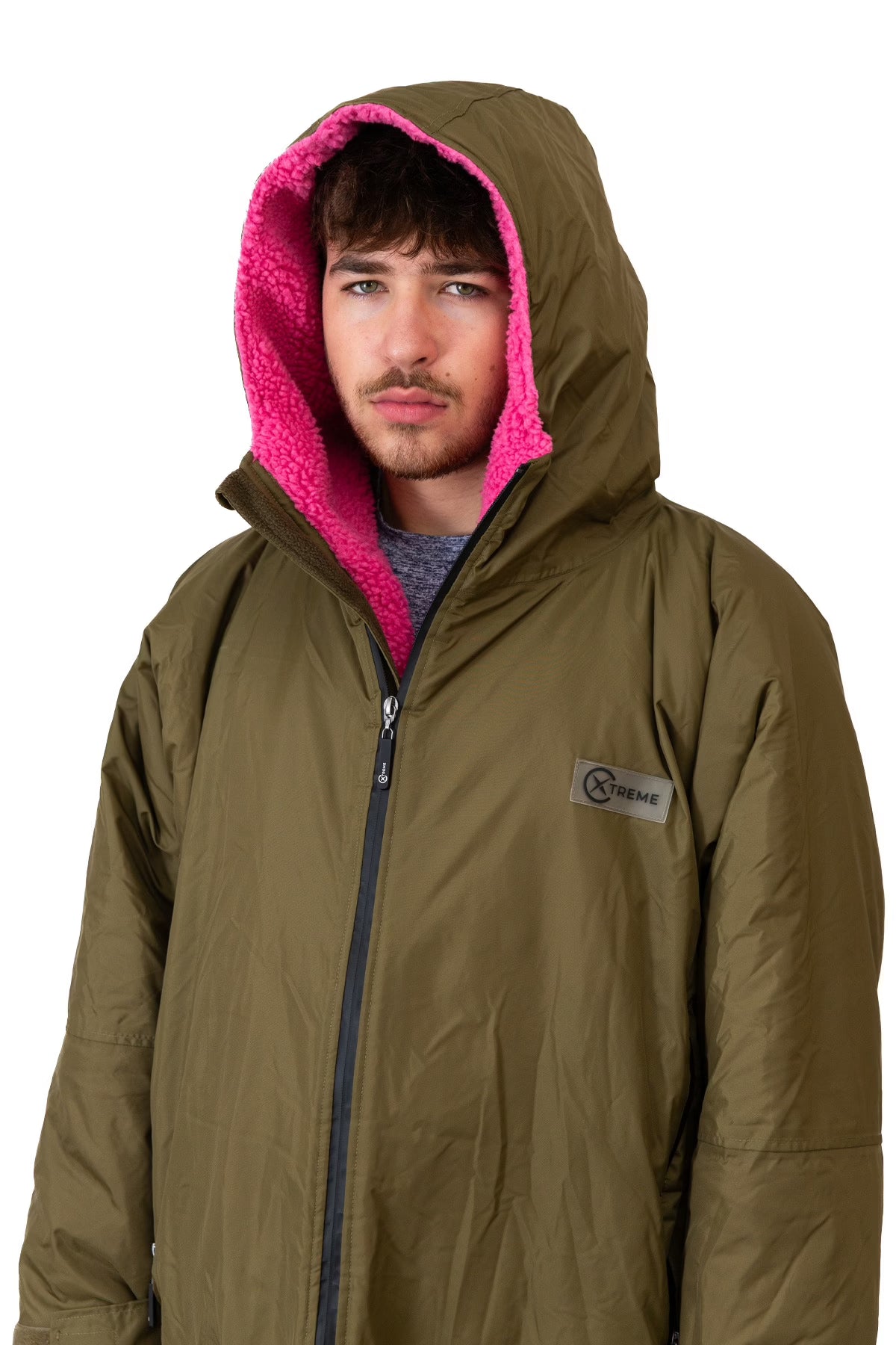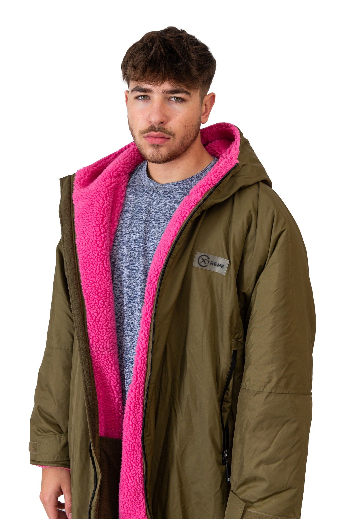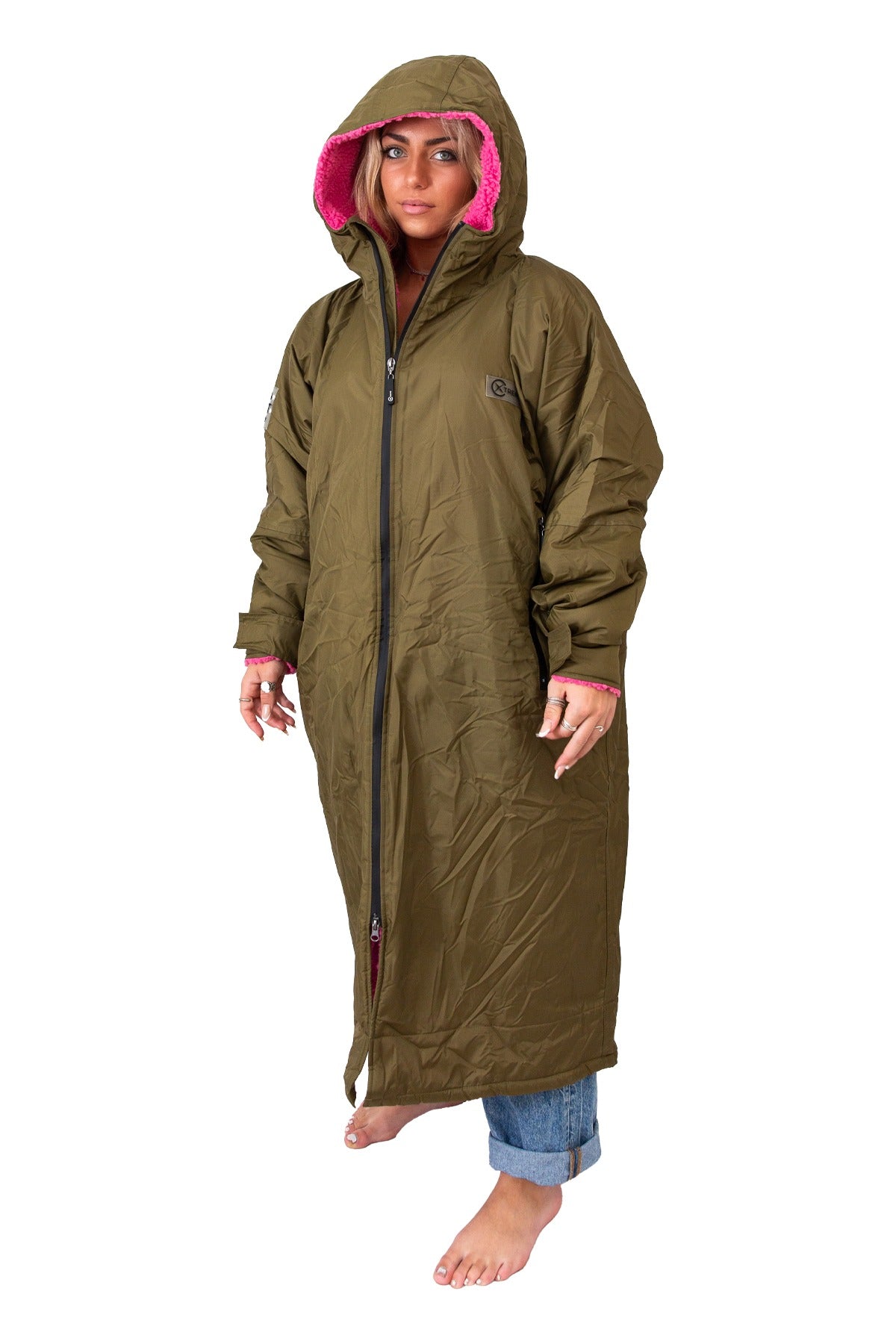 The V1 Green Weatherproof Robe with Pink Lining is naturally oversized, slightly longer, and fleece-lined for ultimate warmth and comfort. Size down 1–2 sizes if you prefer a closer, more fitted coat look. Crafted from a durable outer with fully taped and heat-sealed seams and a cosy fleece lining, this robe keeps you warm and dry in all conditions. With a waterproof rating of 22,000 mm, it offers premium protection from rain, wind, and post-swim chills. The leather-look back hanging loop adds a subtle premium touch, while the oversized fit allows easy changing inside, making it ideal for wild swims, water sports, or everyday outdoor use. Subtle Xtreme branding adds understated style, combining functionality, comfort, and premium design.